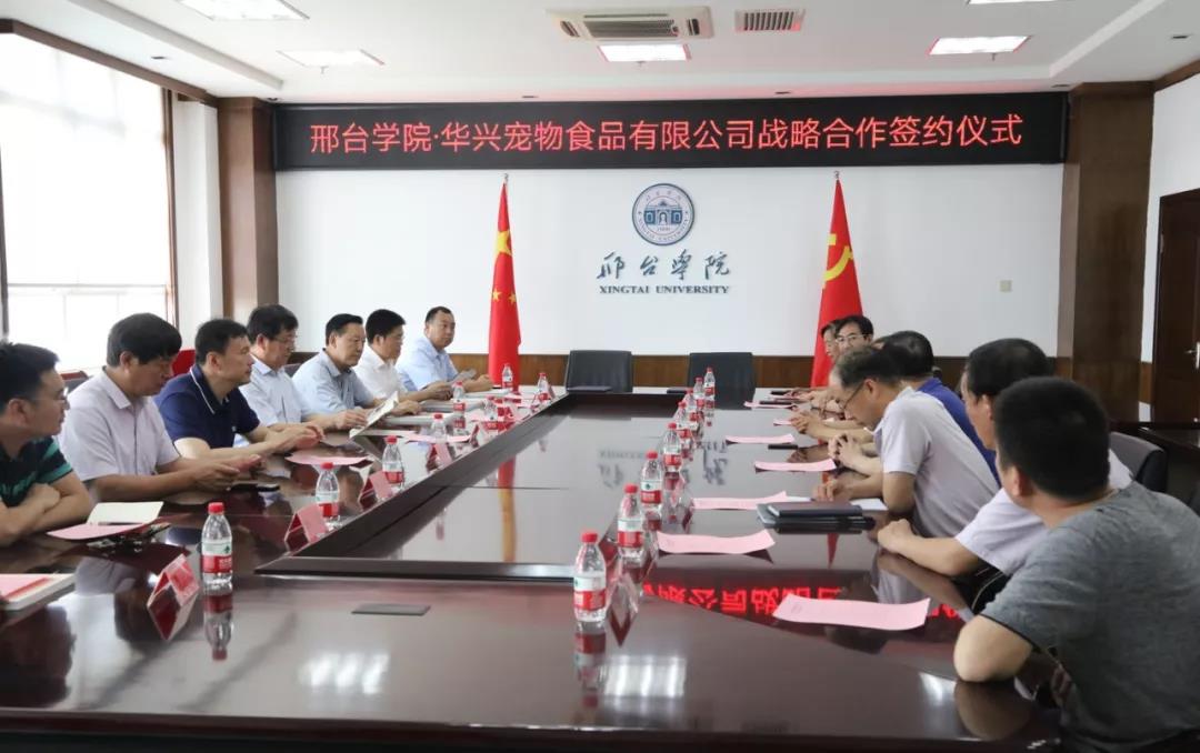 7月3日,南和縣委常委、組織部長李中伏,南和縣委常委、統(tǒng)戰(zhàn)部長樊振宇以及南和縣人大、政協(xié)、農(nóng)業(yè)農(nóng)村局等相關(guān)領(lǐng)導(dǎo)與華興寵物食品有限公司總經(jīng)理冀葉軍一行一起前往邢臺(tái)學(xué)院參加邢臺(tái)學(xué)院·華興寵物食品有限公司戰(zhàn)略合作簽約儀式。邢臺(tái)學(xué)院校長蔡振禹與校方其他主要領(lǐng)導(dǎo)成員參與了合作簽約儀式。